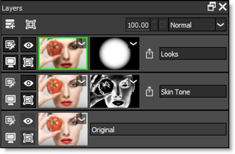 The Layers window shows all filters that have been applied to your image. The most recently applied filter is at the top of the stack, while the earlier applications are at the bottom. When you click on a thumbnail, the Viewer displays that layer.