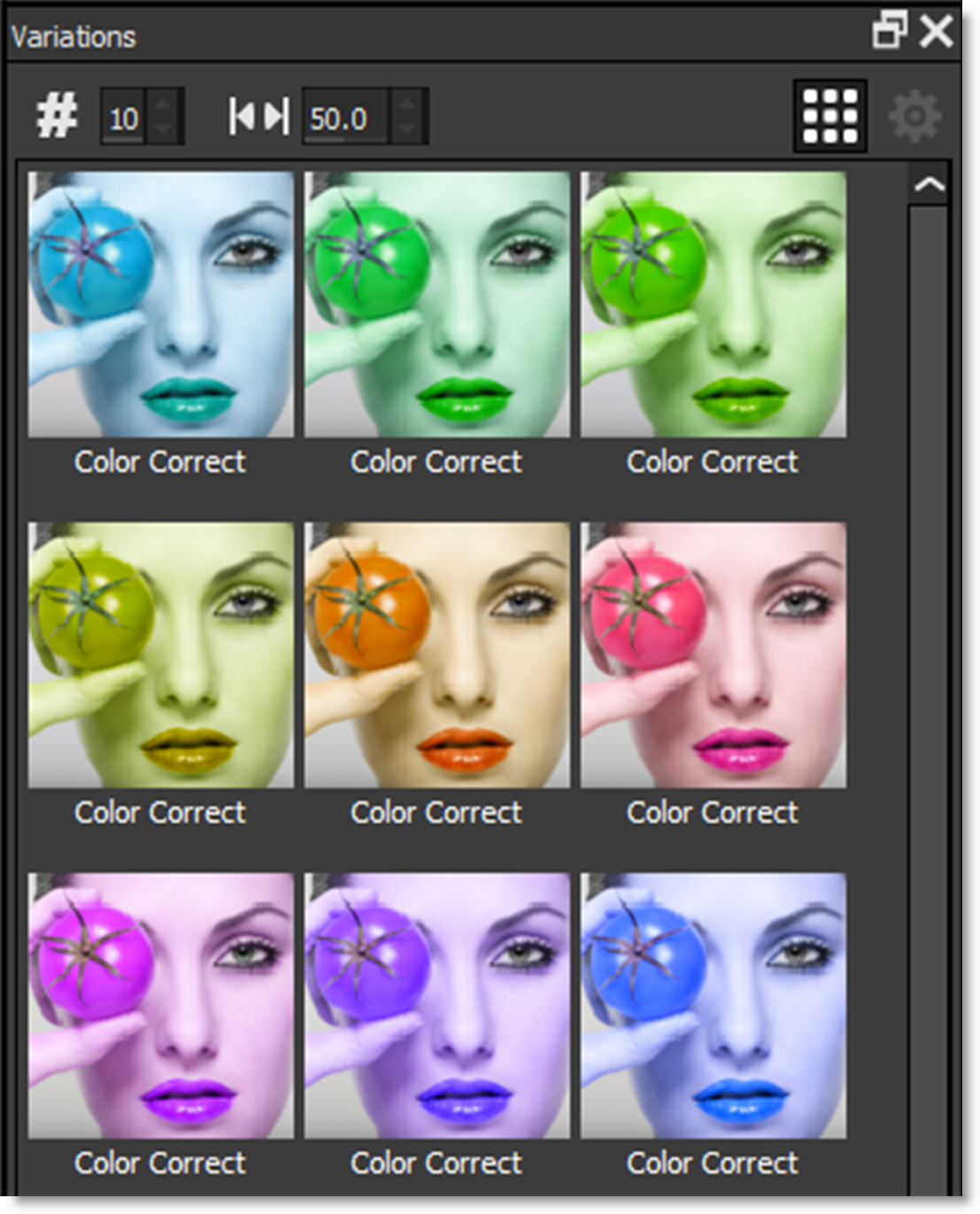 Variations based on either one or two parameters can be created and are displayed as thumbnails in a window below the Parameters window.